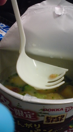 ホワイトポタージュを食べようと、スプーンを突っ込んで熱湯を注いだ。